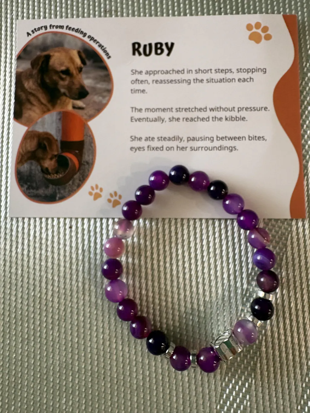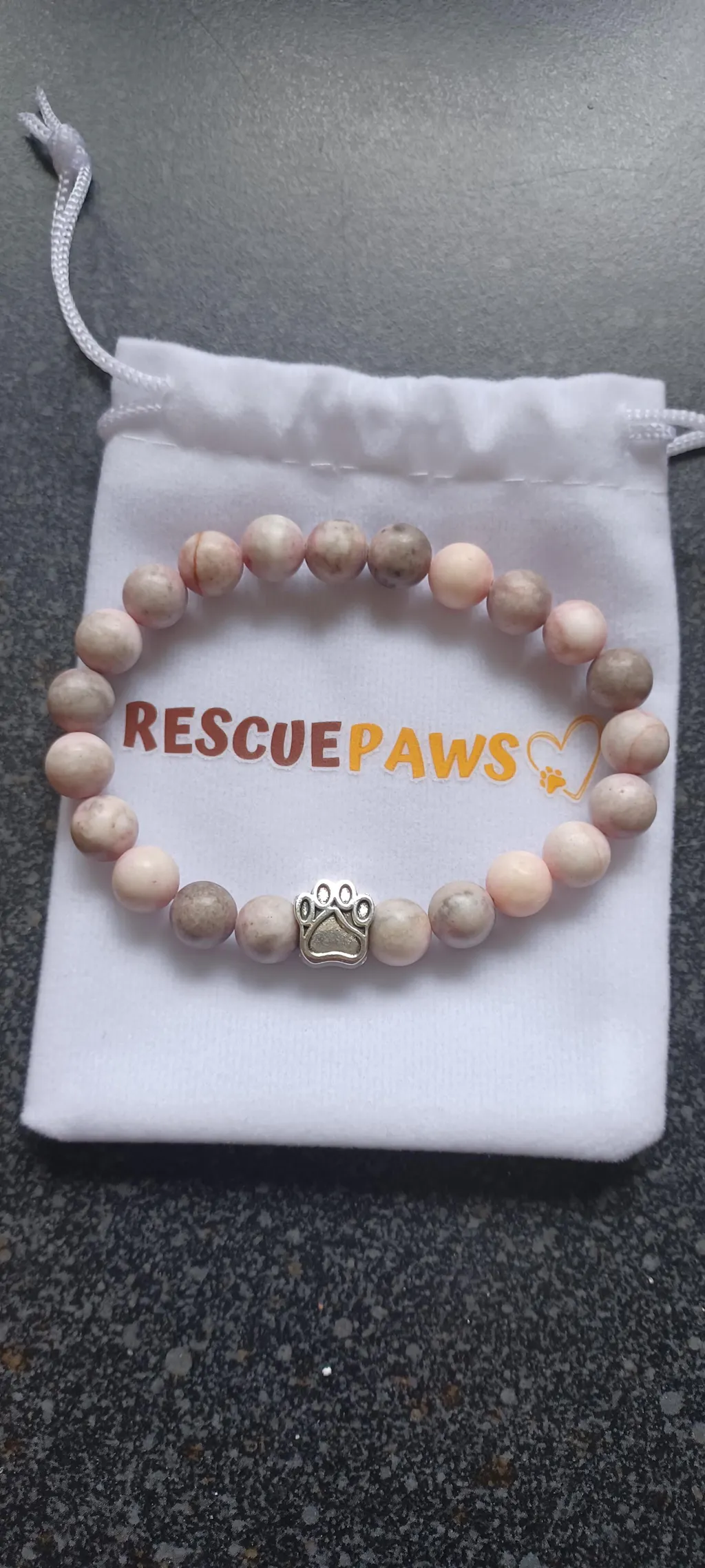 I get another beautiful bracelet by paw rescue 🐾 lovely dust bag with it, name and photos with story. One bracelet feed 10 dogs.