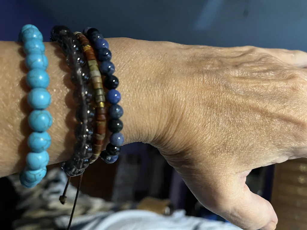 I bought the Lagoon bracelet for my sister. She lost a very dear husky not too long ago to a heart tumor that was found too late, I can see Mel-mels (her name was Melony) eyes in the bracelet. The blue with bits of brown (I also got the light blue only one for her current husky). The bracelet itself isn't too over the top, it's nice and simple. I have 3 that I wear in a stack based on my boys' coats. (Black, dark brown, and tan. I can't remember the names of those bracelets) Oh, and I have a 7 month old son that is constantly yanking on mine and they haven't snapped or broken.