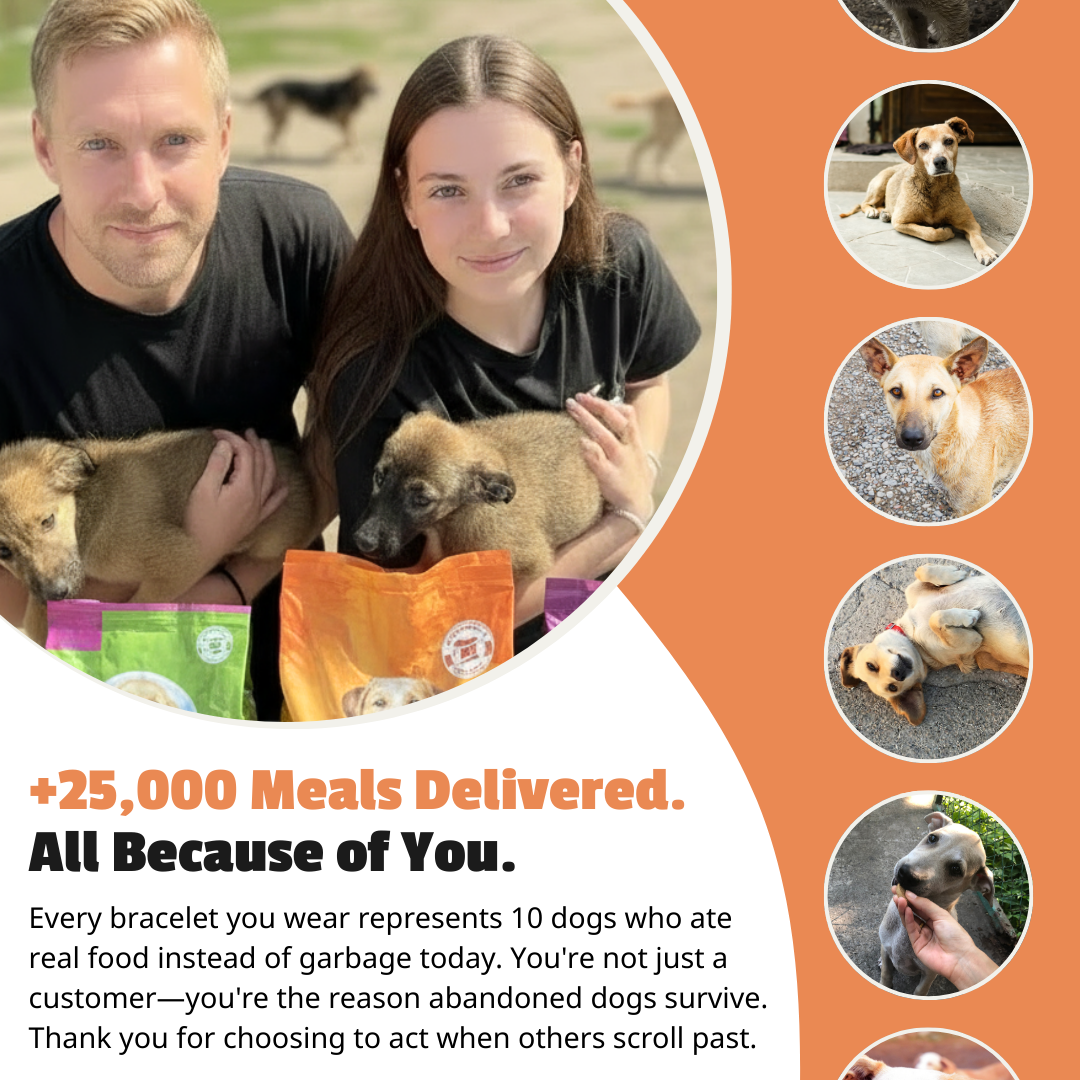 We're a small passionate team on a huge mission. Every bracelet truly feeds 10 abandoned dogs—and you'll see the proof within 30 days.